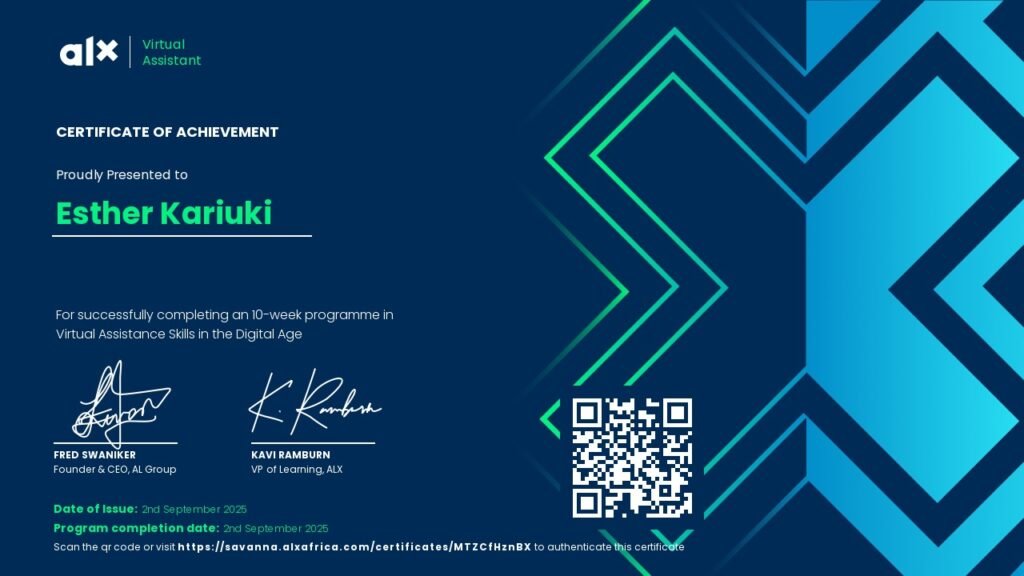 🔹 Certified Professional – I am a trained and certified Virtual Assistant from ALX Africa, equipped with modern skills and tools to deliver quality support.